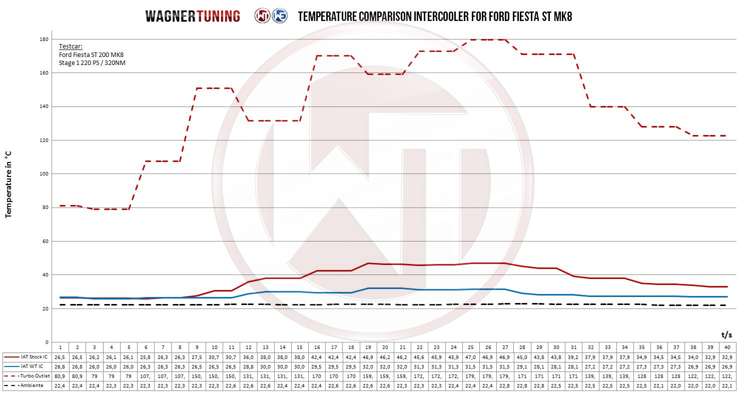 Vi monterede denne intercooler på vores demo S3 8Y – På en kold vinterdag erfarede vi generelt en stigning af indsugningstemperatur på Δ6 grader under acceleration fra start til slut. Efter montering af Wagner Tuning’s intercooler blev IAT’en holdt nede således temperaturen under acceleration forblev den samme.