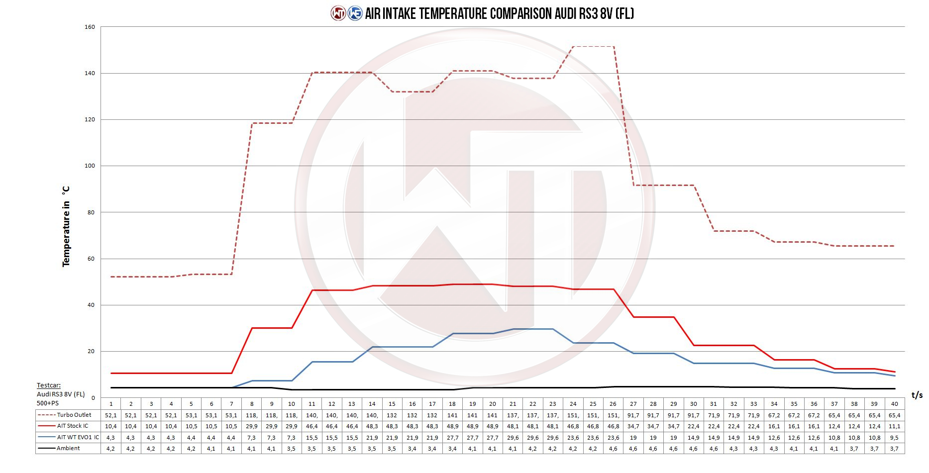 Vi monterede denne intercooler på vores demo S3 8Y – På en kold vinterdag erfarede vi generelt en stigning af indsugningstemperatur på Δ6 grader under acceleration fra start til slut. Efter montering af Wagner Tuning’s intercooler blev IAT’en holdt nede således temperaturen under acceleration forblev den samme.